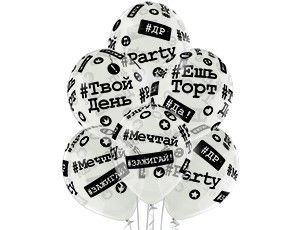Высококачественный шар из натурального латекса, прозрачный кристалл. Шары с пятисторонним - круговая печать, шелкографическим рисунком - Хештеги. #Твой день, #Ешь торт, #ДР, #Зажигай, #Мечтай, #Party - модные надписи на больших шариках, однозначно, понравятся каждому. Предназначен для розничной продажи воздушных шариков. Идеальный ассортимент для оформлений, т.к. при плетении из него гирлянд - рисунок будет очень хорошо виден.
