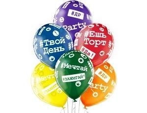 Высококачественный шар из натурального латекса, прозрачный кристалл.Шары с пятисторонним - круговая печать, шелкографическим рисунком - Хештеги. #Твой день, #Ешь торт, #ДР, #Зажигай, #Мечтай, #Party - модные надписи на больших шариках, однозначно, понравятся каждому. Идеальный ассортимент для оформлений, т.к. при плетении из него гирлянд - рисунок будет очень хорошо виден.
